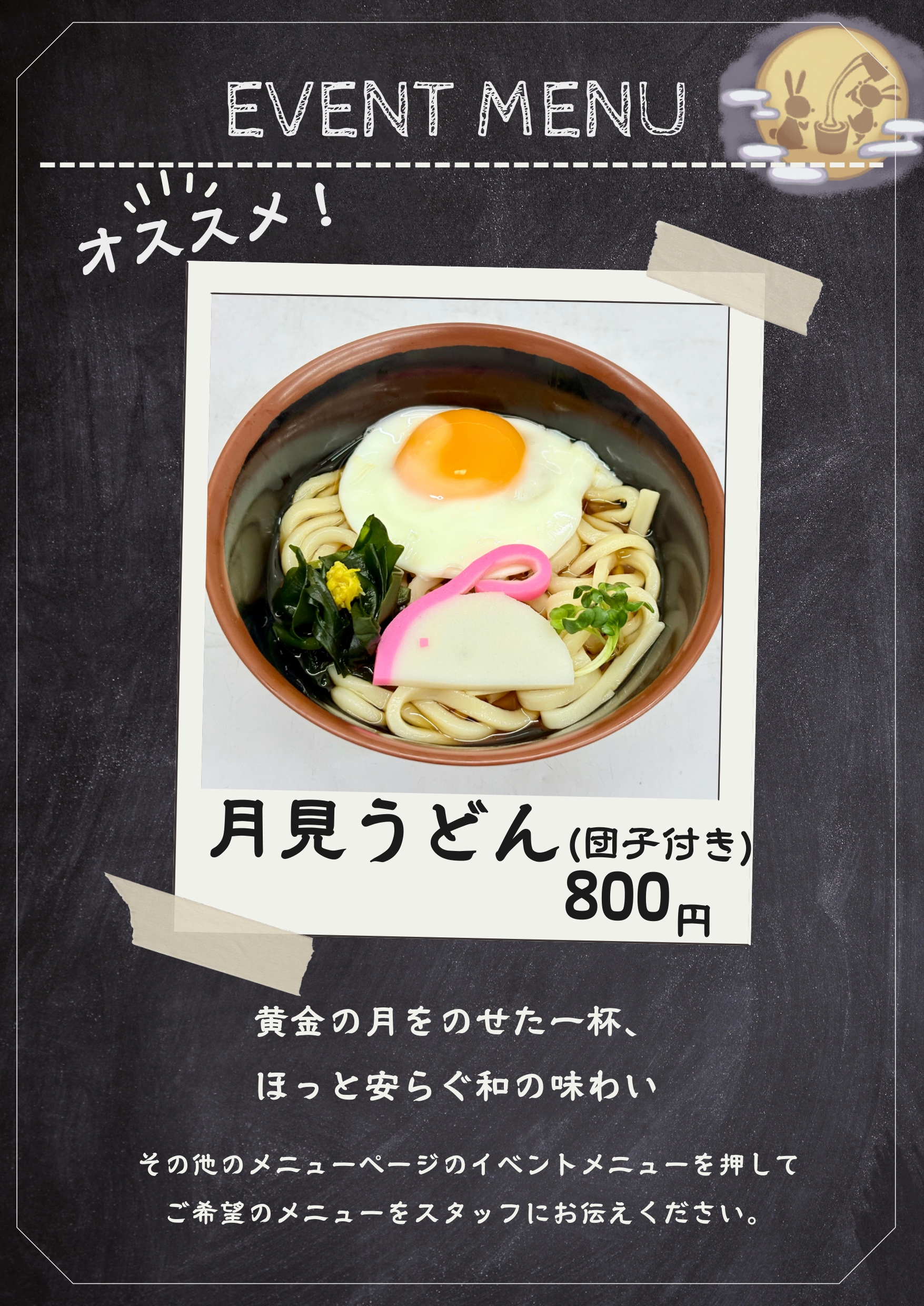 新着情報 2025年10月4日 10/5(日)~10/6(月)月見うどんの販売について 【10月5日(日)~10月6日(月)月見うどんの販売について】 10月6日(月)は中秋の名月です。 中秋の名月は、秋の真ん中を意味する「中秋」と、美しい月を意味する「名月」を組み合わせたもので、空気が澄んで月が鮮やかに見えることから名付けられました。 湯~トピアかんなみでは、中秋の名月にちなみまして、2日間限定で「月見うどん」を販売いたします。 是非この機会にご賞味ください。 みなさまのお越しをスタッフ一同お待ちしております。 Tweet