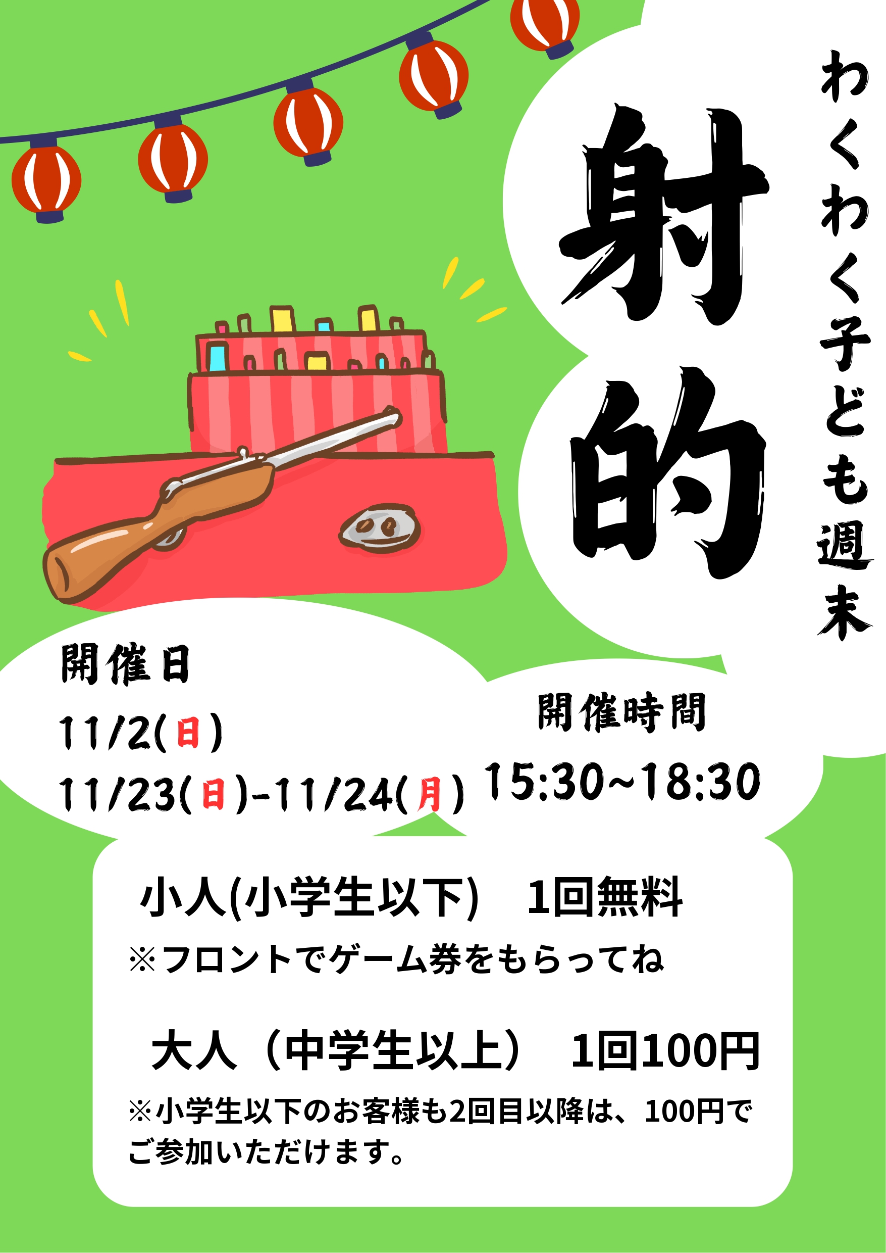 新着情報 2025年11月2日 本日開催イベント 【11/2(日)開催イベントについて】 ・射的(景品付き) その他、当てくじ(1回100円)・ぬり絵・知育玩具・けん玉もご用意しております。 ※開催場所 正面玄関イベントスペース ※開催時間 15:30~18:30 ※参加条件 小学6年生までがが対象 ※参加費 フロントでゲーム券を配布します。 1回目無料(大人・子ども2回目以降は100円) 皆様のお越しをスタッフ一同お待ちしております。
