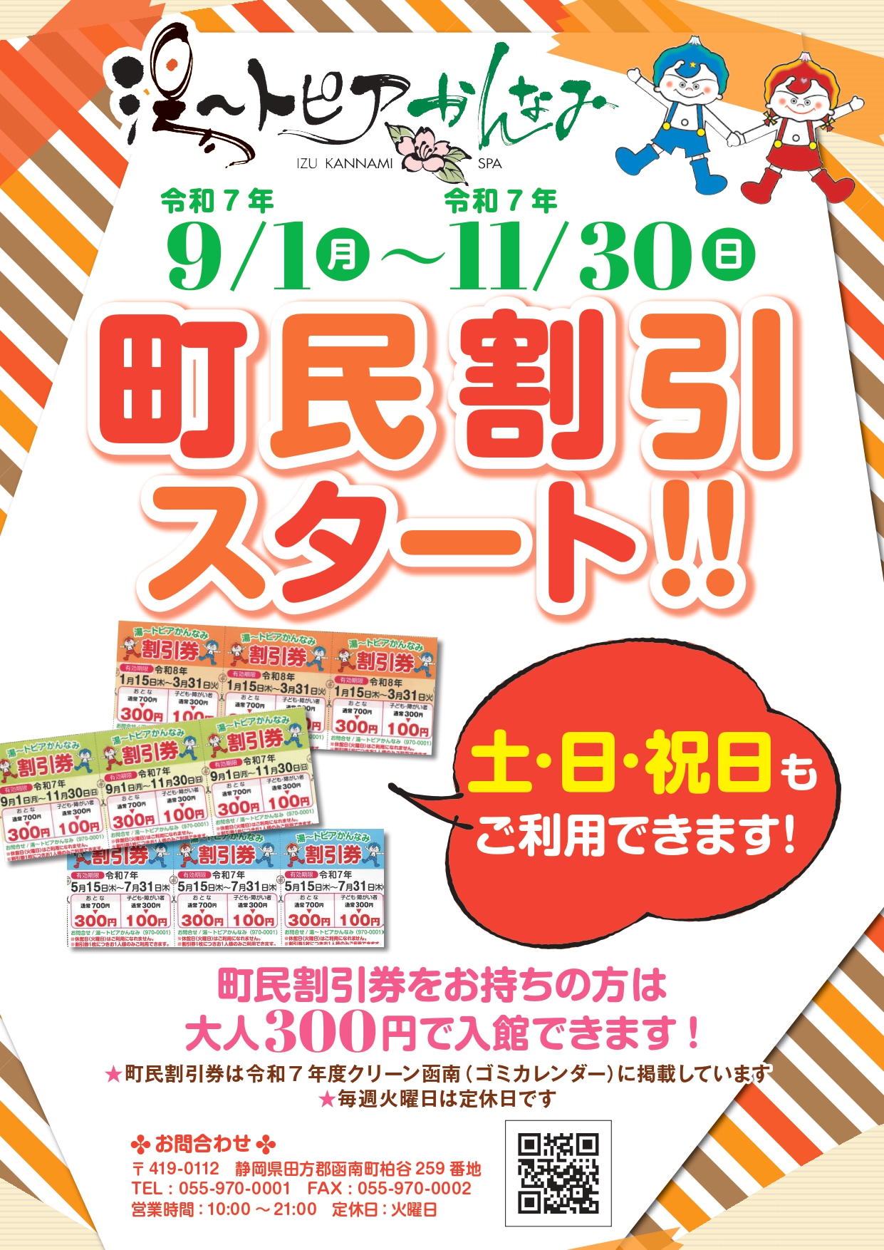 新着情報 2025年11月29日 11月30日(日)町民割引第2弾終了 【まもなく町民割引利用終了】 令和7年9月1日(月)から開催しておりました町民割引が11月30日(日)で終了となります。土日祝日もご利用可能となっております。 次回開催は令和8年1月15日(木)からとなりますので、是非この機会にご利用ください。令和7年度クリーン函南(ゴミカレンダー)に掲載している町民割引券をご持参いただきますと、大人700円→300円、障がい者・子ども300円→100円でご入館いただけます。 皆様のお越しをスタッフ一同お待ちしております。