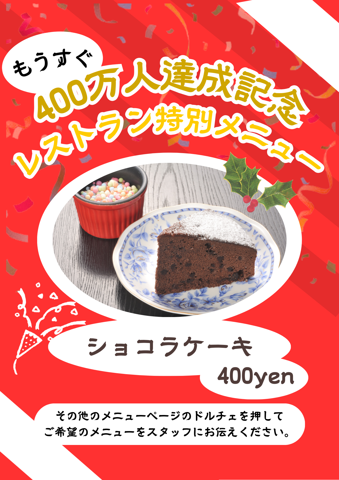 新着情報 2025年12月8日 レストラン特別メニューについて 【レストラン特別メニューについて】 「もうすぐ400万人達成記念」と題し、レストランにて特別メニューを販売いたします。 ショコラケーキ 400円(税込) 期間限定商品となりますので、是非この機会にご賞味ください。