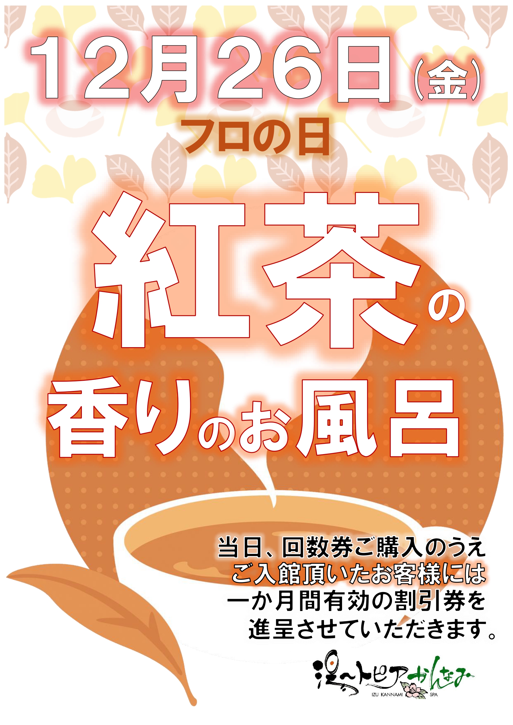 新着情報 2025年12月26日 12月26日(金)は『紅茶の香りの湯』 【12月26日(金)は風呂の日】 毎月26日は(フロの日)ということで変り湯を実施しております。 今月は『紅茶の香りの湯』です。鮮やかな色と香りをお楽しみください。 当日回数券をご購入の上、ご入館いただいたお客様には割引券を進呈させていただきます。 プレミアム商品券もご利用いただけます。 皆様のお越しをスタッフ一同お待ちしております。