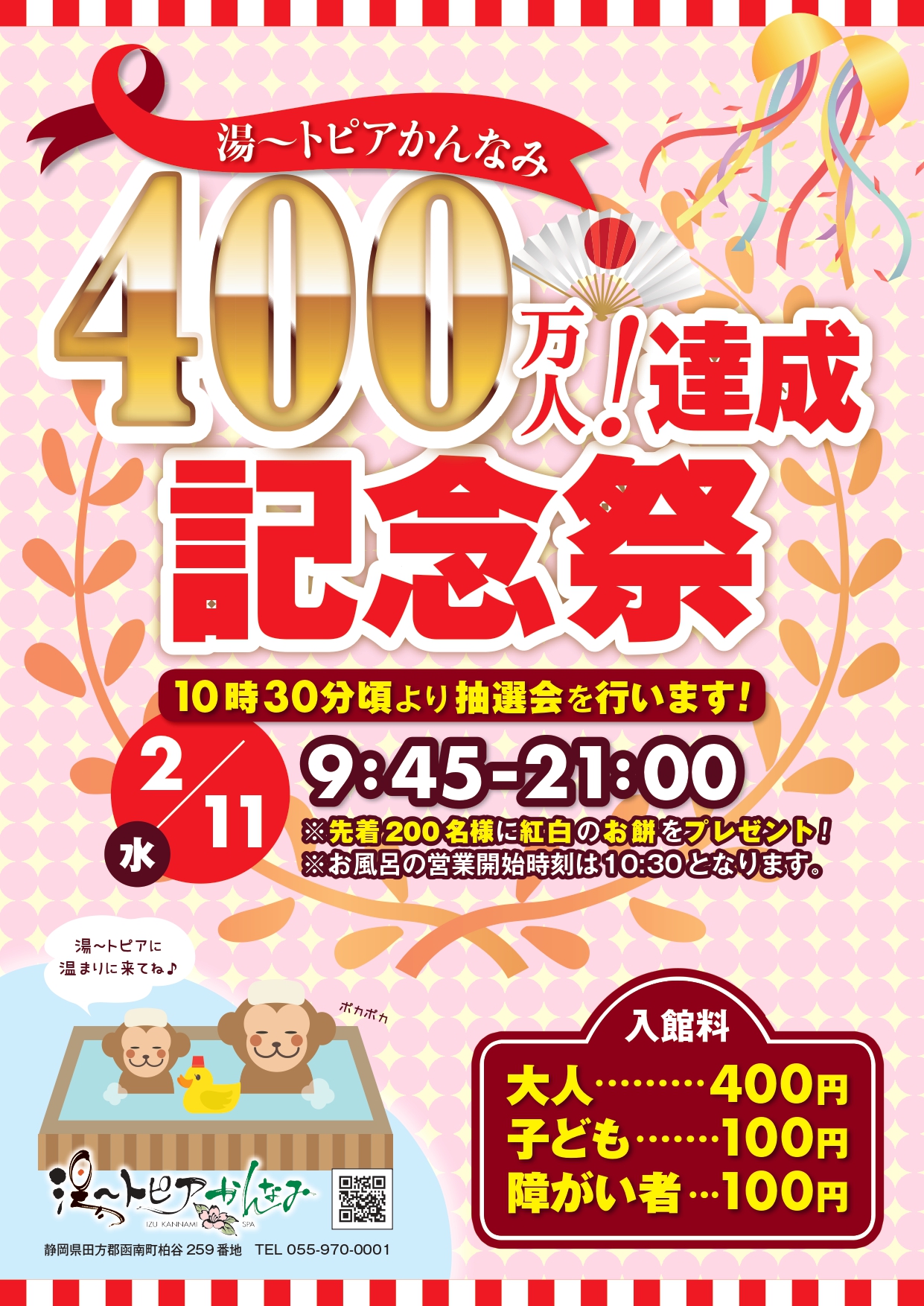 【2026年2月11日(水・祝)400万人!達成記念祭のお知らせ】