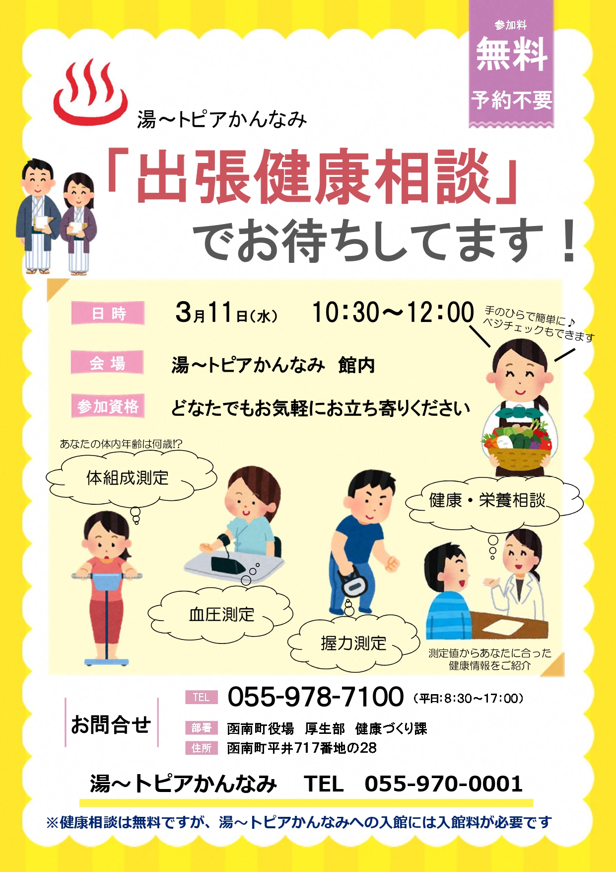 新着情報 2026年3月6日 3月11日(水)「出張健康相談会」の開催 【出張健康相談会の開催について】 健康チェックや健康栄養相談ができる函南町役場健康づくり課様による「出張健康 相談会」を開催いたします。 日時 :3月11日(水)10:30~12:00 会場 :湯~トピアかんなみ 館内 対象者:どなたでも可能 参加料:無料 ※別途、入館料が必要です。 是非、お気軽にお立ち寄りください。 皆様のお越しをスタッフ一同お待ちしております。