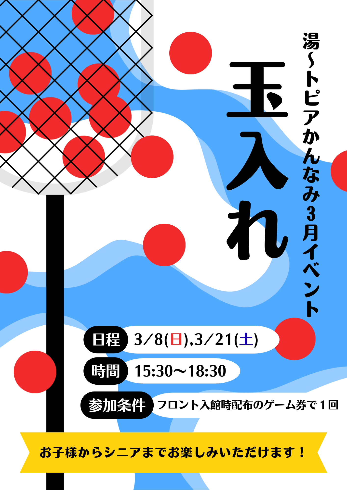 新着情報 2026年3月8日 3月8日(日)開催イベント 【3月8日(日)開催イベントについて】 ・わなげ(景品付き) その他、ぬり絵・知育玩具・けん玉もご用意しております。 ※開催場所 正面玄関イベントスペース ※開催時間 15:30~18:30 ※参加条件 入館者全員 ※参加費 フロントでゲーム券を配布します。 1回目無料(2回目以降は100円) 皆様のご来館を、スタッフ一同心よりお待ちしております。