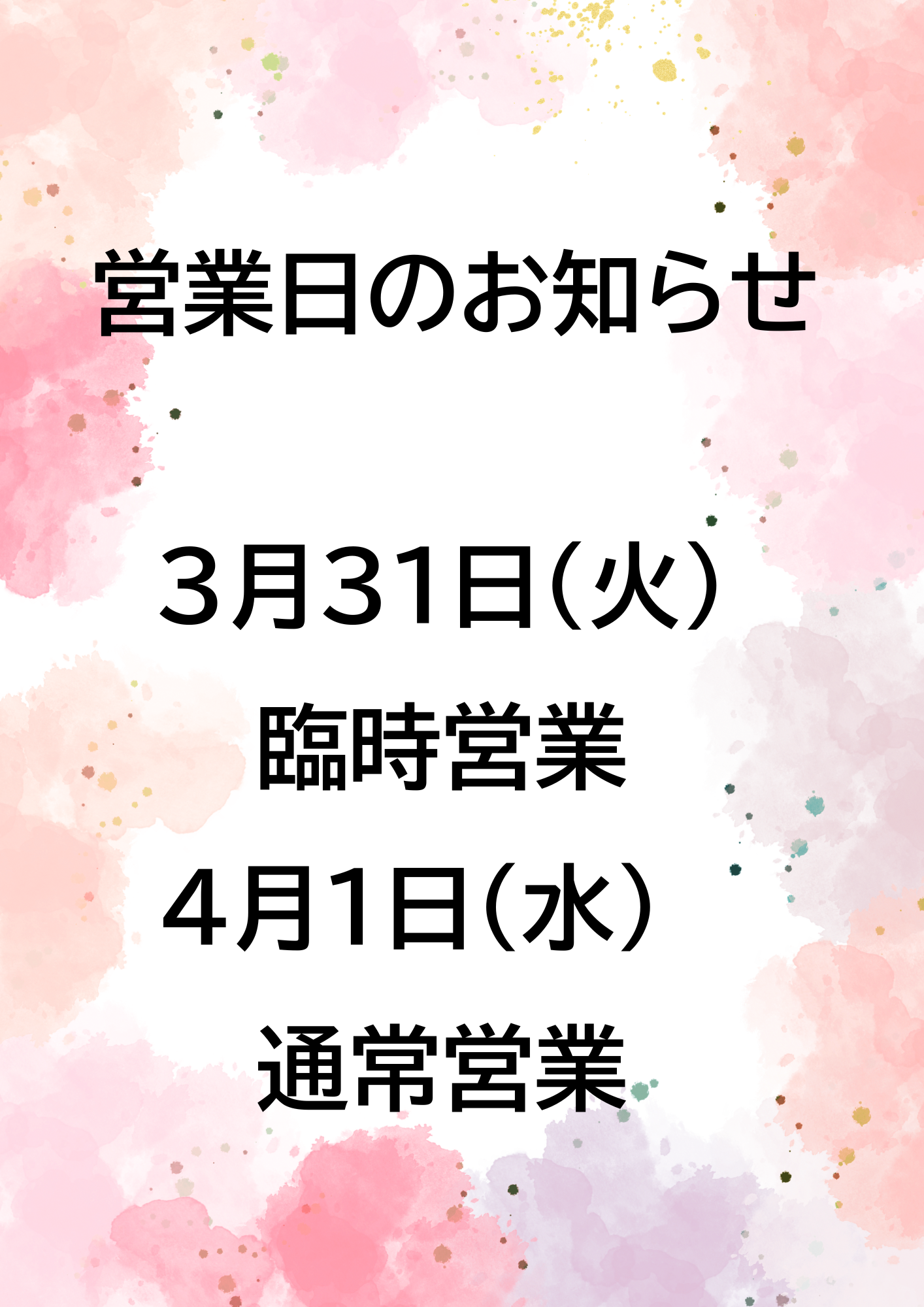 なお、4月1日(水)は通常営業となります。
